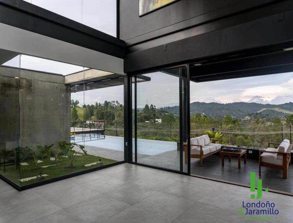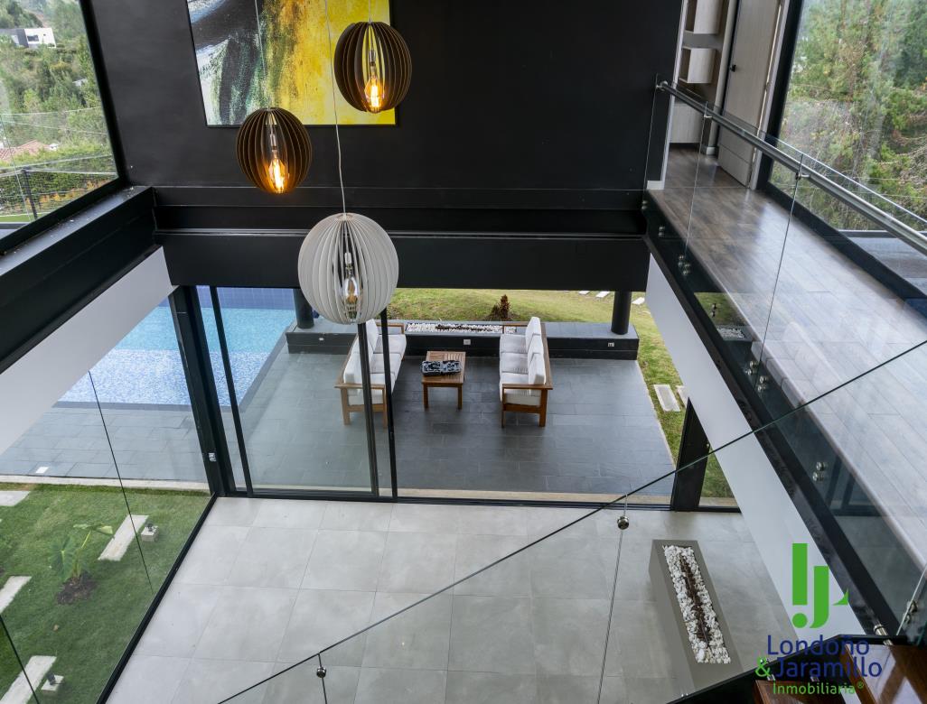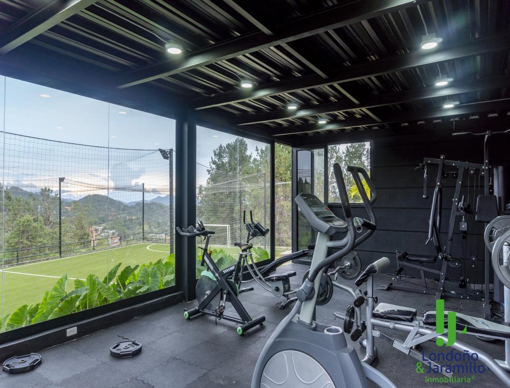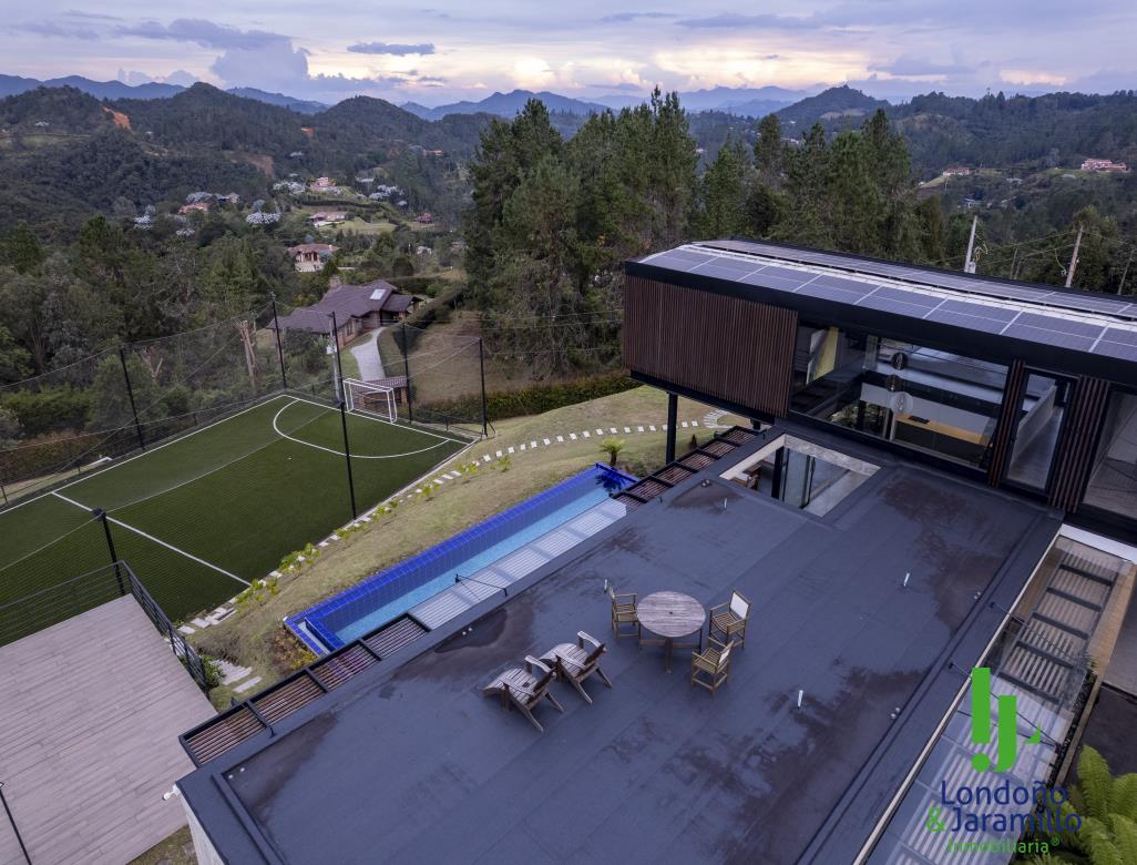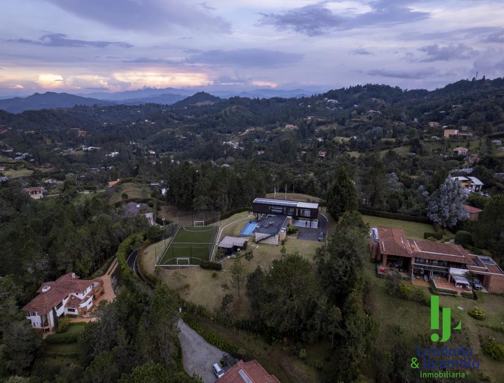 Venta casa de 750 m2 construidos, 6.500 m2 de lote, con 4 parqueaderos cubiertos, 6 de visitantes. Cuenta con 4 habitaciones grandes cada una con baño y vestier, 1 baño social, alcoba de servicio, estudio de música, sala-comedor grande, zona de ropas, útiles, despensa, cocina abierta, gimnasio, rack de sistemas, sala de TV, cuarto de linos, paneles solares, turco, piscina, jacuzzi, zona verde cancha de futbol. Además, un apartamento de huéspedes completo.