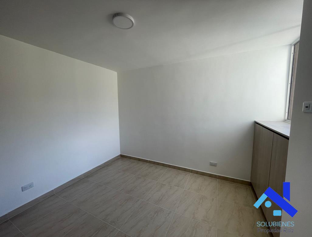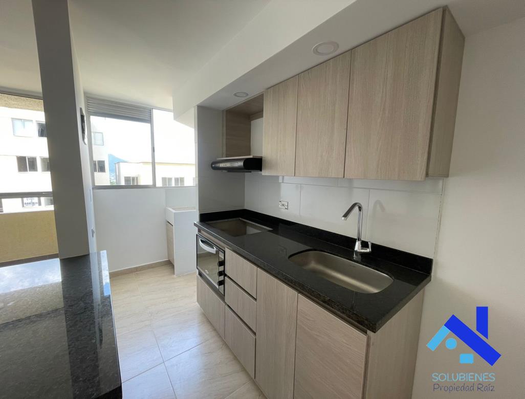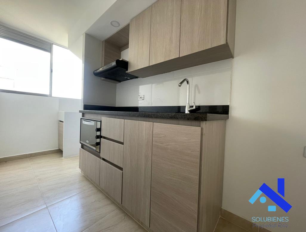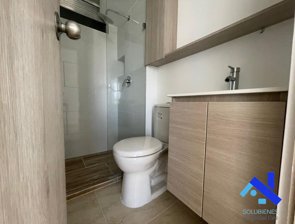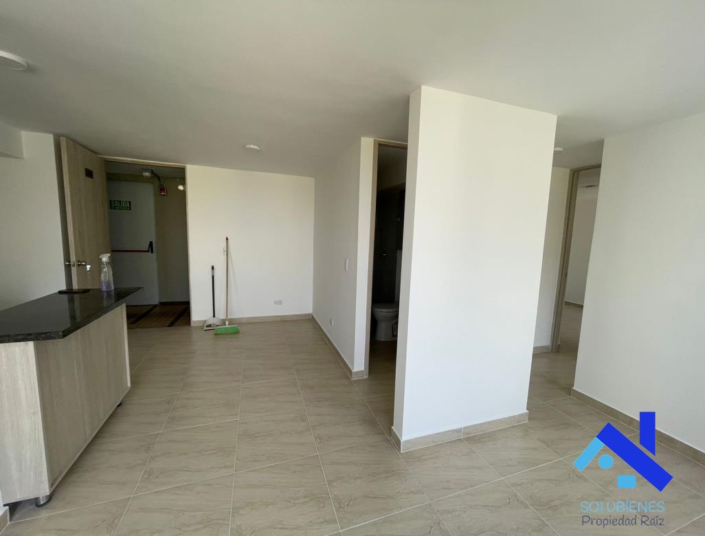 54 metros cuadrados, distribuidos en 2 alcobas, 2 closet, estudio, 2 baños cabinados en vidrio templado, salón comedor con balcón, cocina integral abierta con mesón en mármol y barra tipo americana, zona de ropas, red de gas natural, pisos en cerámica.