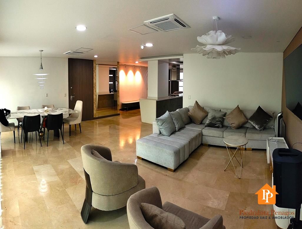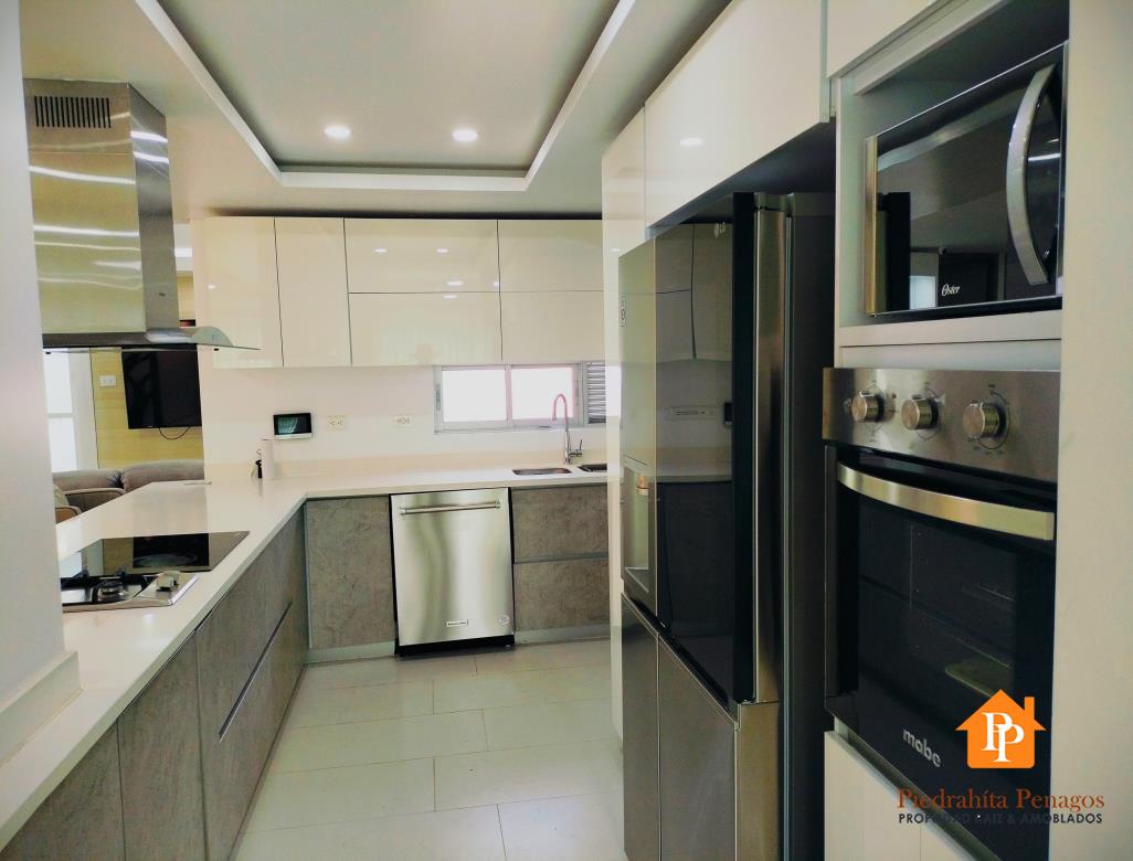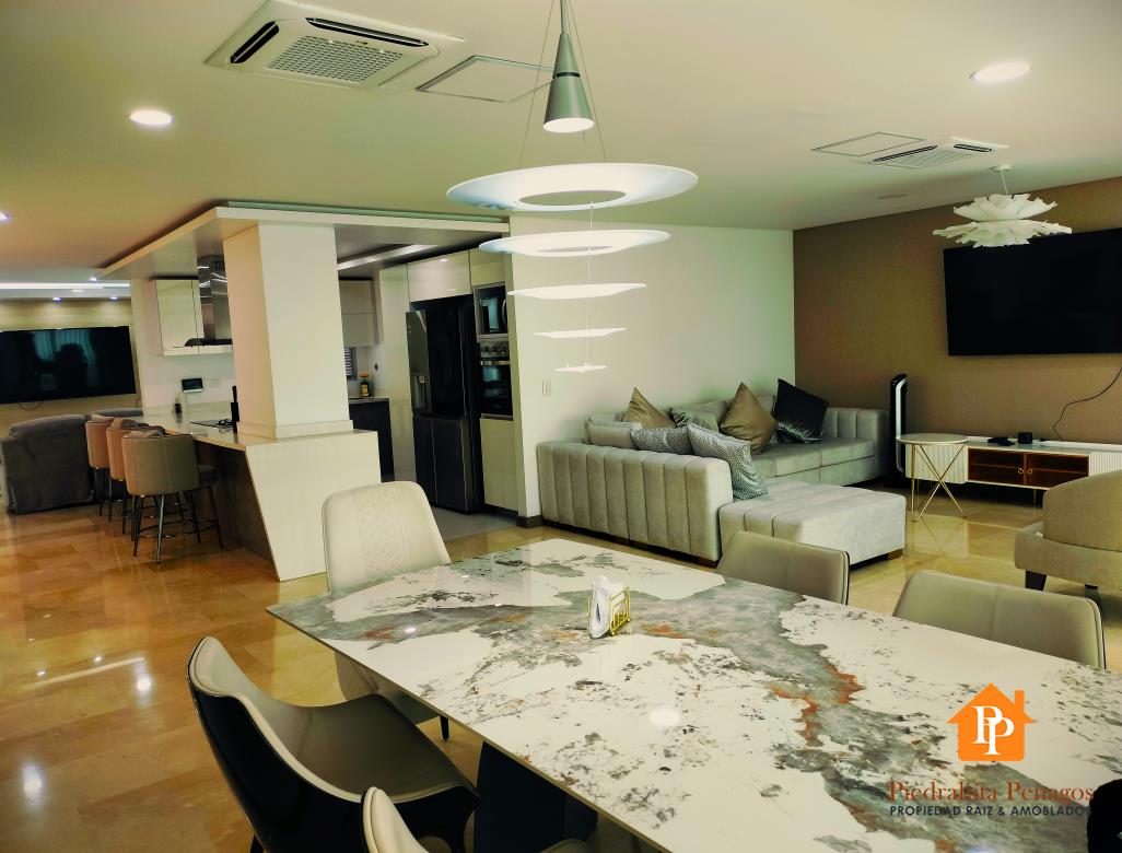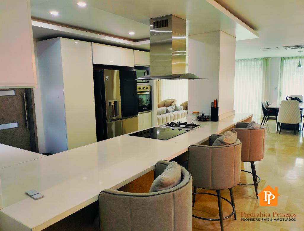 El amplio salón comedor con capacidad para seis puestos es ideal para recibir invitados, mientras que la cocina integral con estufa de inducción y gas, lavavajillas y nevera tipo nevecom satisfará a los paladares más exigentes.