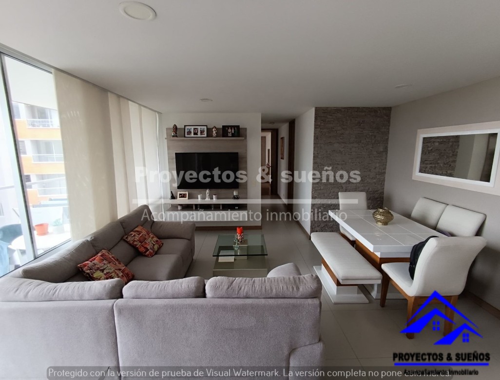 90m2, Distribuido en 3 alcobas, 2 closet y vestier, salón comedor con balcón, cocina integral abierta, mesón en mármol, 2 baños cabinados en vidrio templado, pisos en porcelanato y madera laminada, estudio, zona de ropas, red de gas, parqueadero y cuarto util.