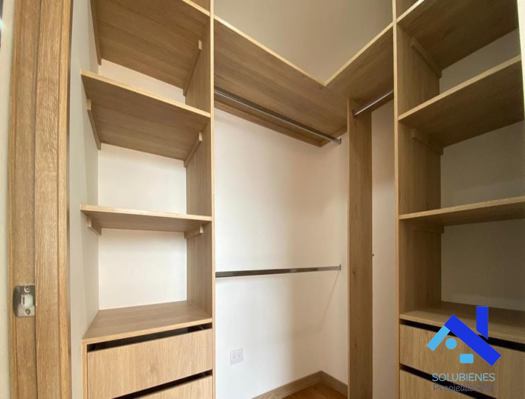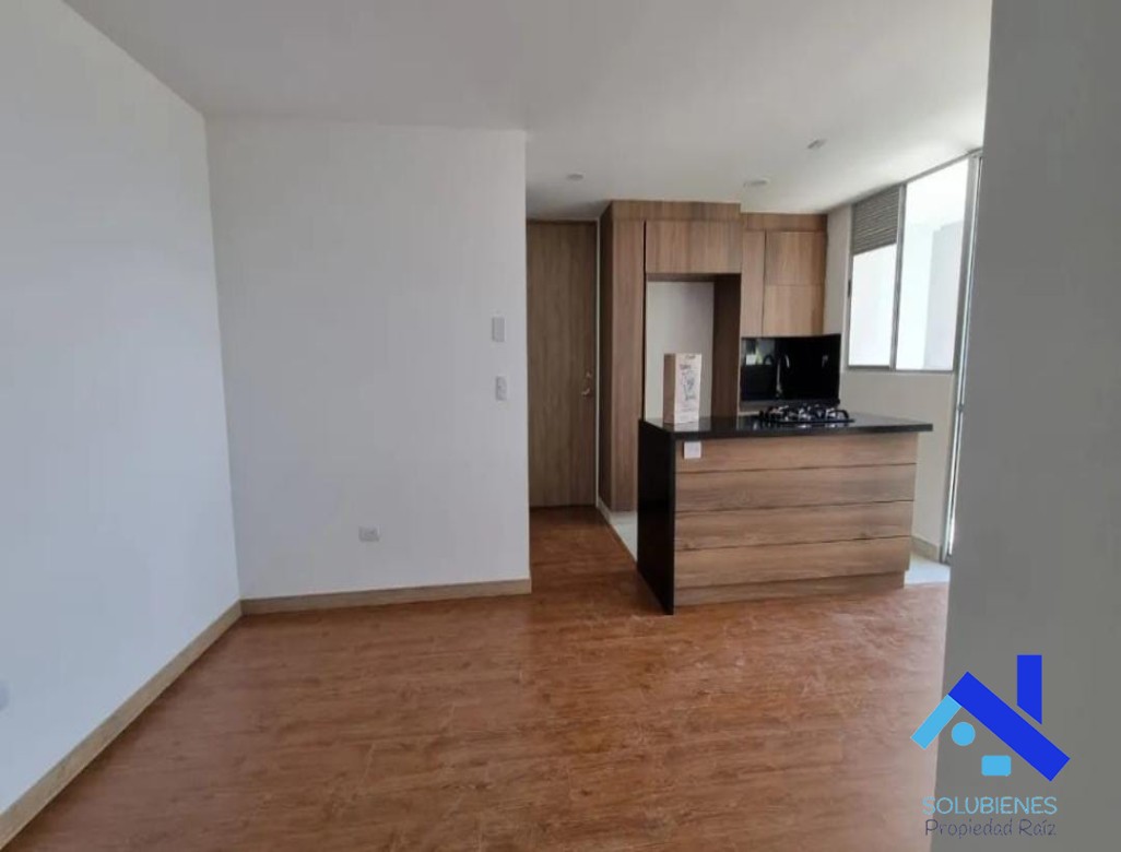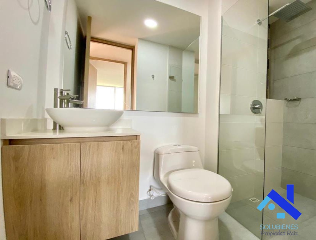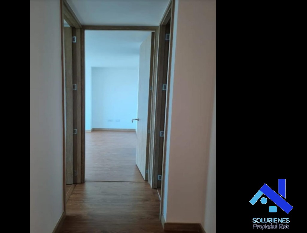 72 metros cuadrados, distribuidos en 2 alcobas, 1 closet, 1 vestier, 2 baños cabinados en vidrio templado, salón comedor con balcón, cocina integral abierta con mesón en mármol y barra tipo americana, zona de ropas, red de gas natural, pisos en madera laminada, parqueadero,+ cuarto útil.