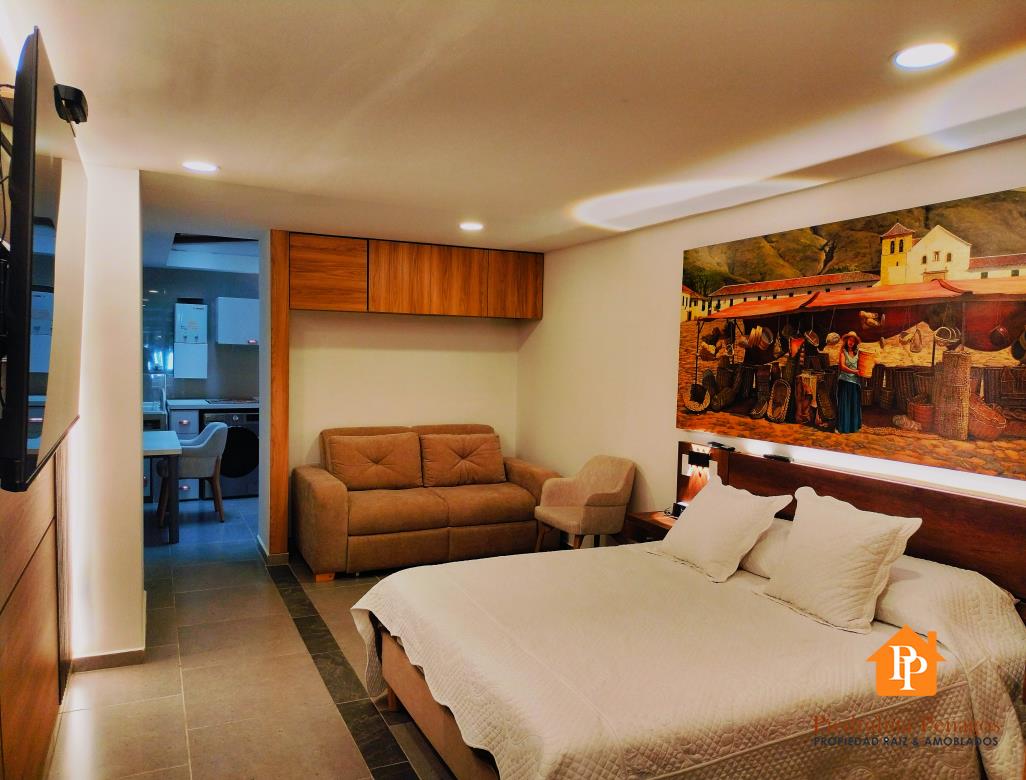 apartaestudio en le poblado con licencia para rentas cortas apartaestudio de 50 m2 el cual consta de : sala balcón cocina integral zona de ropas alcoba principal con baño baño social biblioteca edificio con porteria 24 horas, piscin ...
